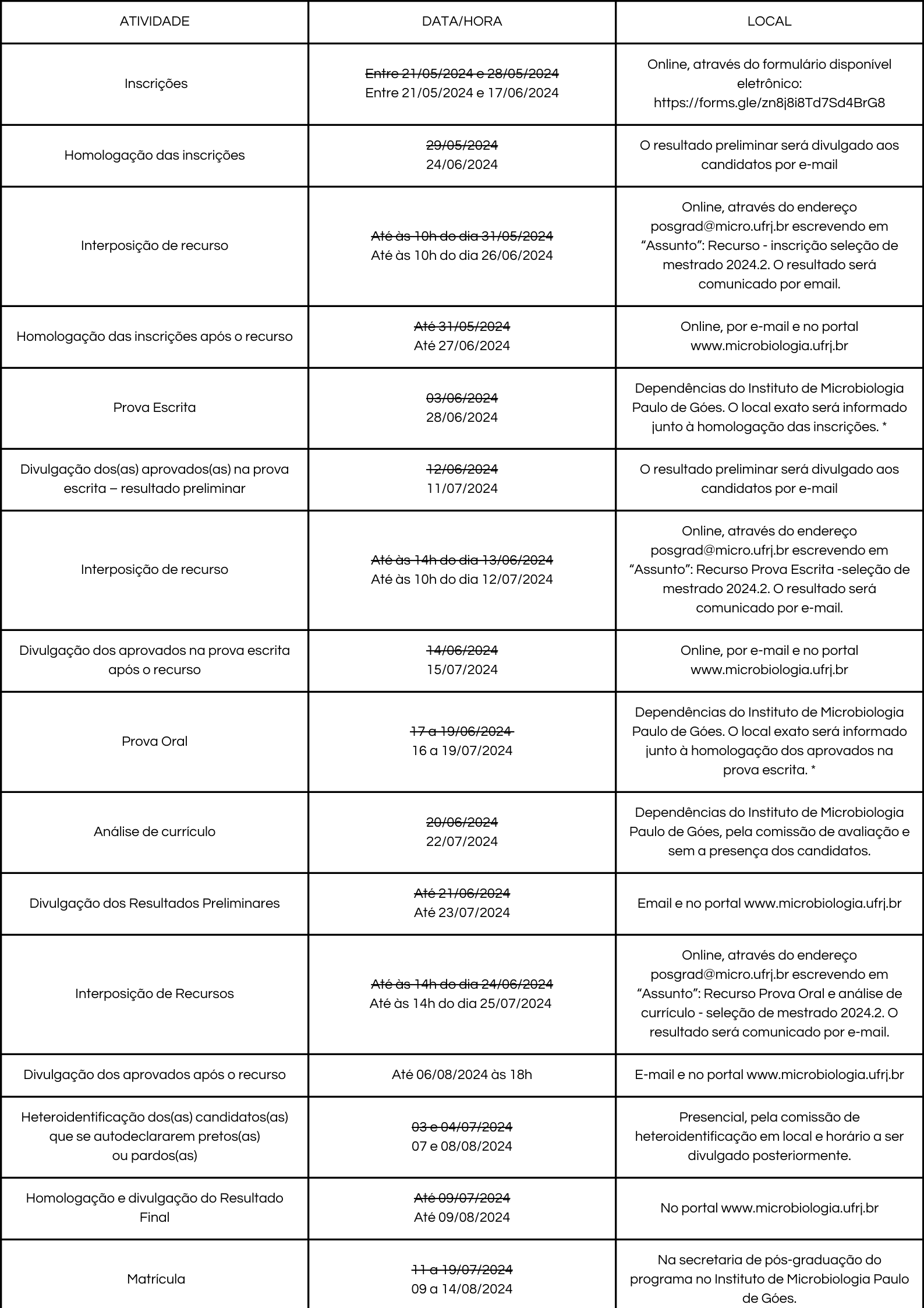 A Coordenação de Pós-Graduação em Ciências (Microbiologia), no uso de suas atribuições, faz saber, por meio deste documento, que ficam alterados os seguintes itens do Edital Processo Seletivo para o MESTRADO Edital N.º 397.